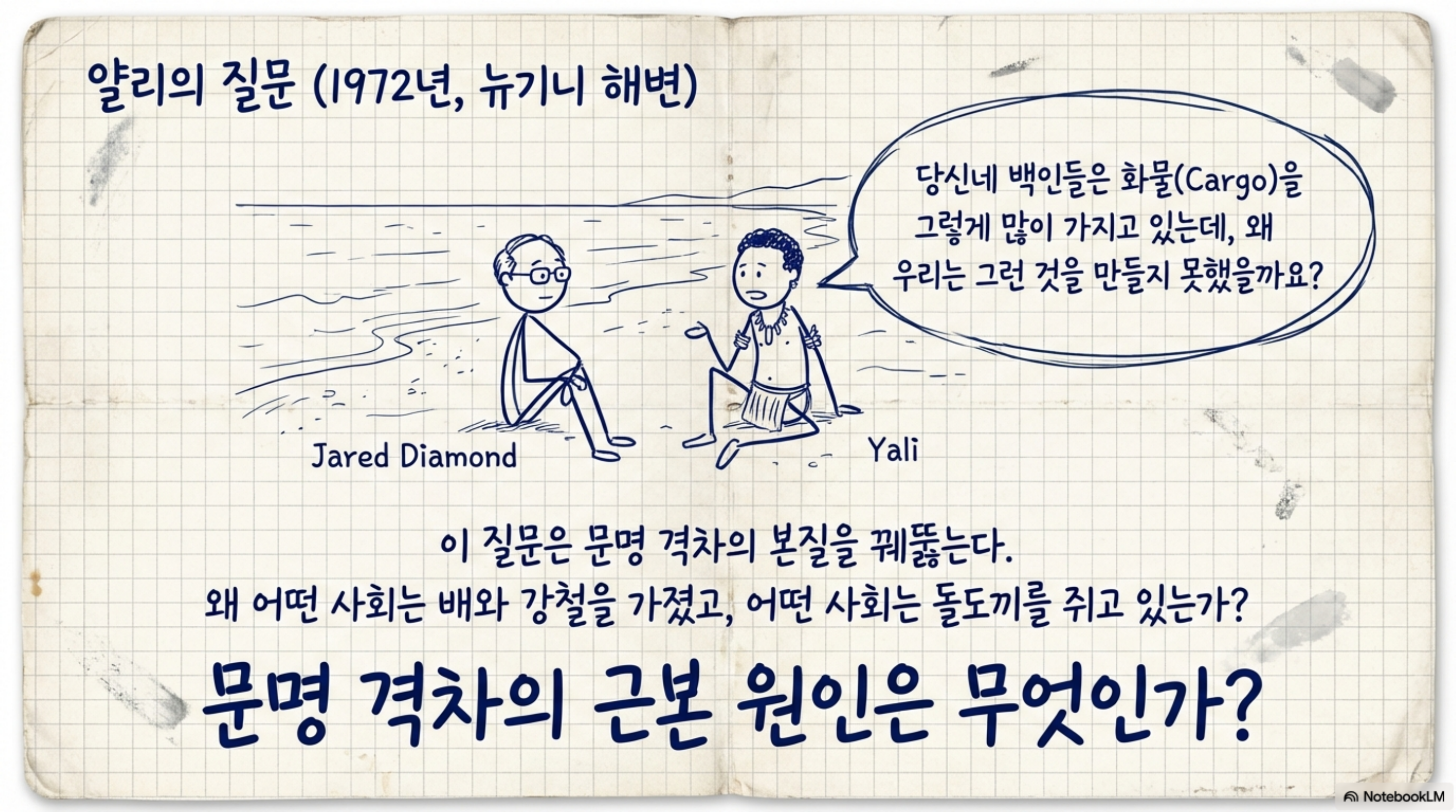 조류학자 재레드 다이아몬드는 현지 정치인 얄리(Yali)로부터 이 질문을 받는다. 단순해 보이는 이 질문이, 이후 25년에 걸친 방대한 연구로 이어졌고, 결국 퓰리처상을 수상한 책 『총, 균, 쇠』가 탄생했다.