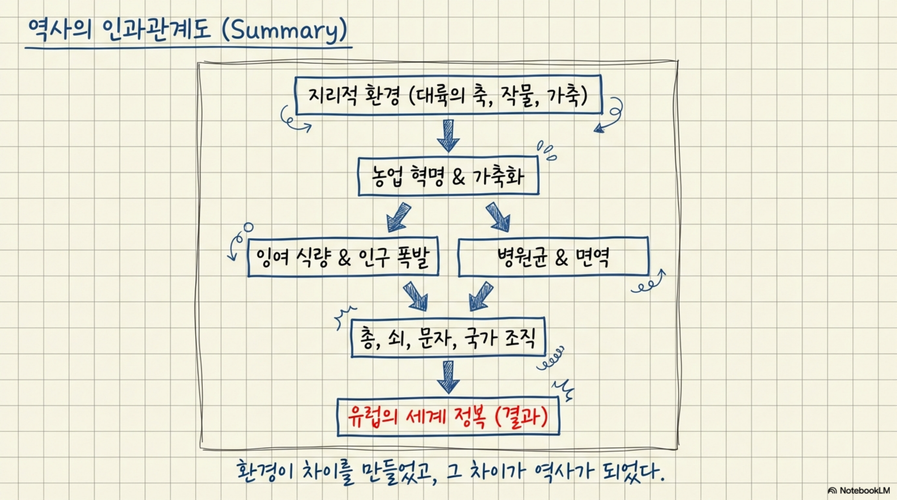 지리적 환경 → 농업혁명 → 잉여식량 + 병원균면역 → 총·쇠·문자·국가 → 유럽의 세계 정복