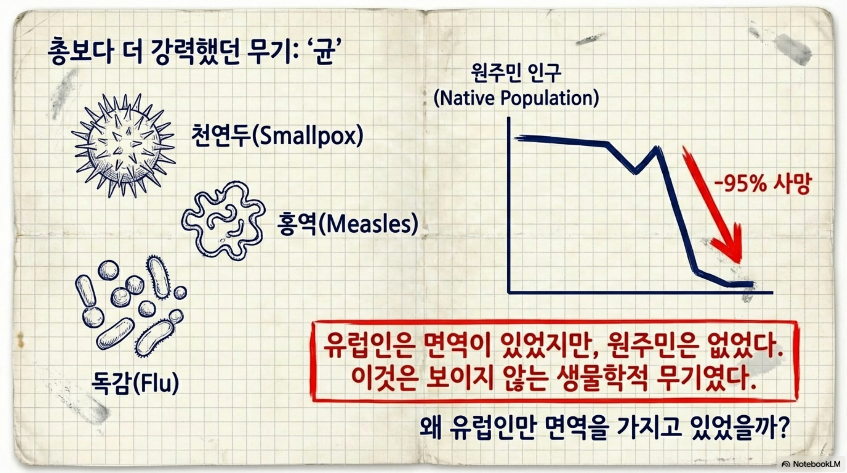 수천 년간 가축과 밀착해 살아온 유라시아인들은 천연두, 홍역, 독감 같은 무서운 병원균들과 싸우며 집단 면역을 얻었다. 콜럼버스가 아메리카에 도착했을 때, 원주민 인구의 95%가 이 '보이지 않는 무기'에 스러졌다. 총보다 균이 더 강했다.