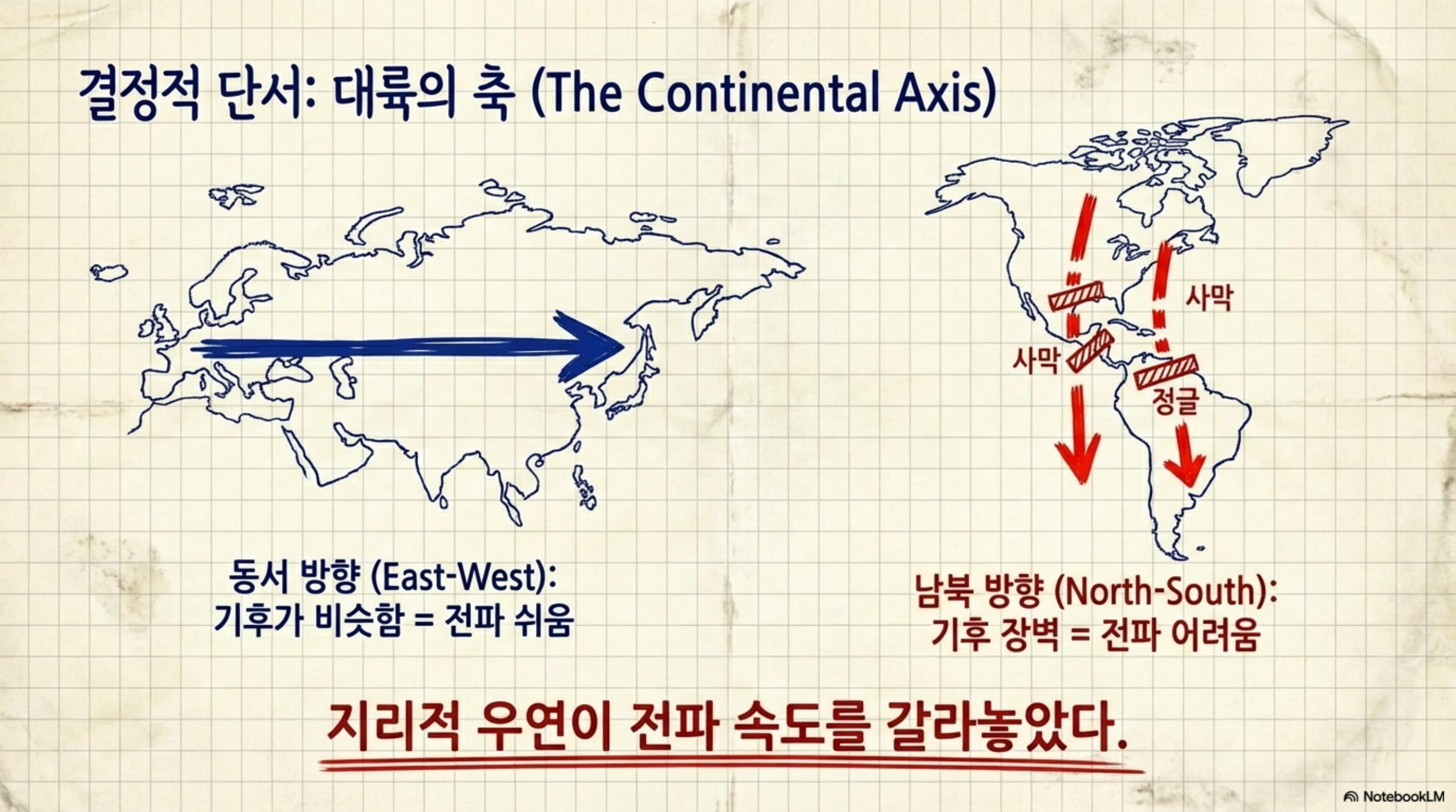 동서 방향(기후 비슷 = 전파 쉬움) vs 남북 방향(기후 장벽 = 전파 어려움)