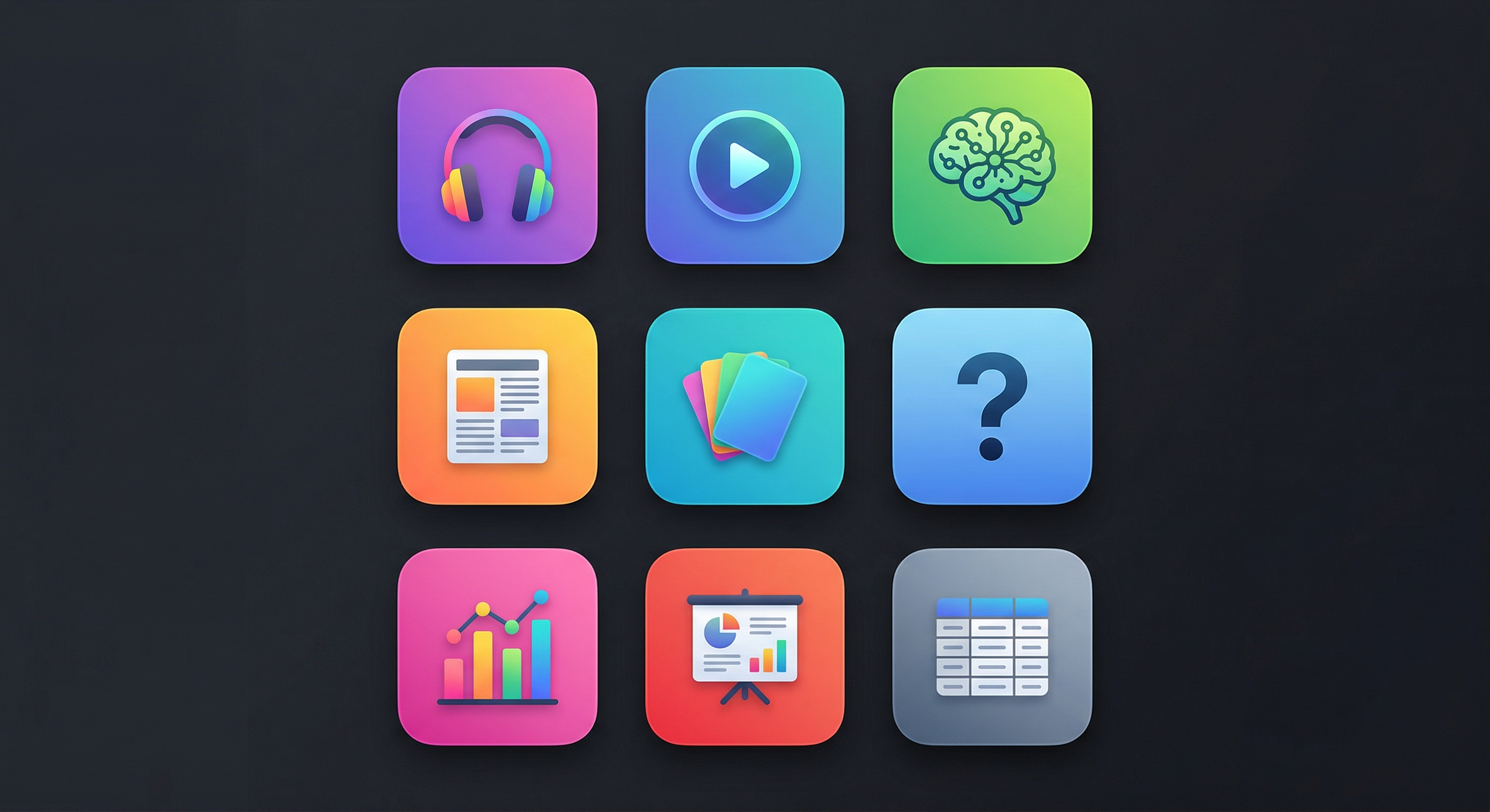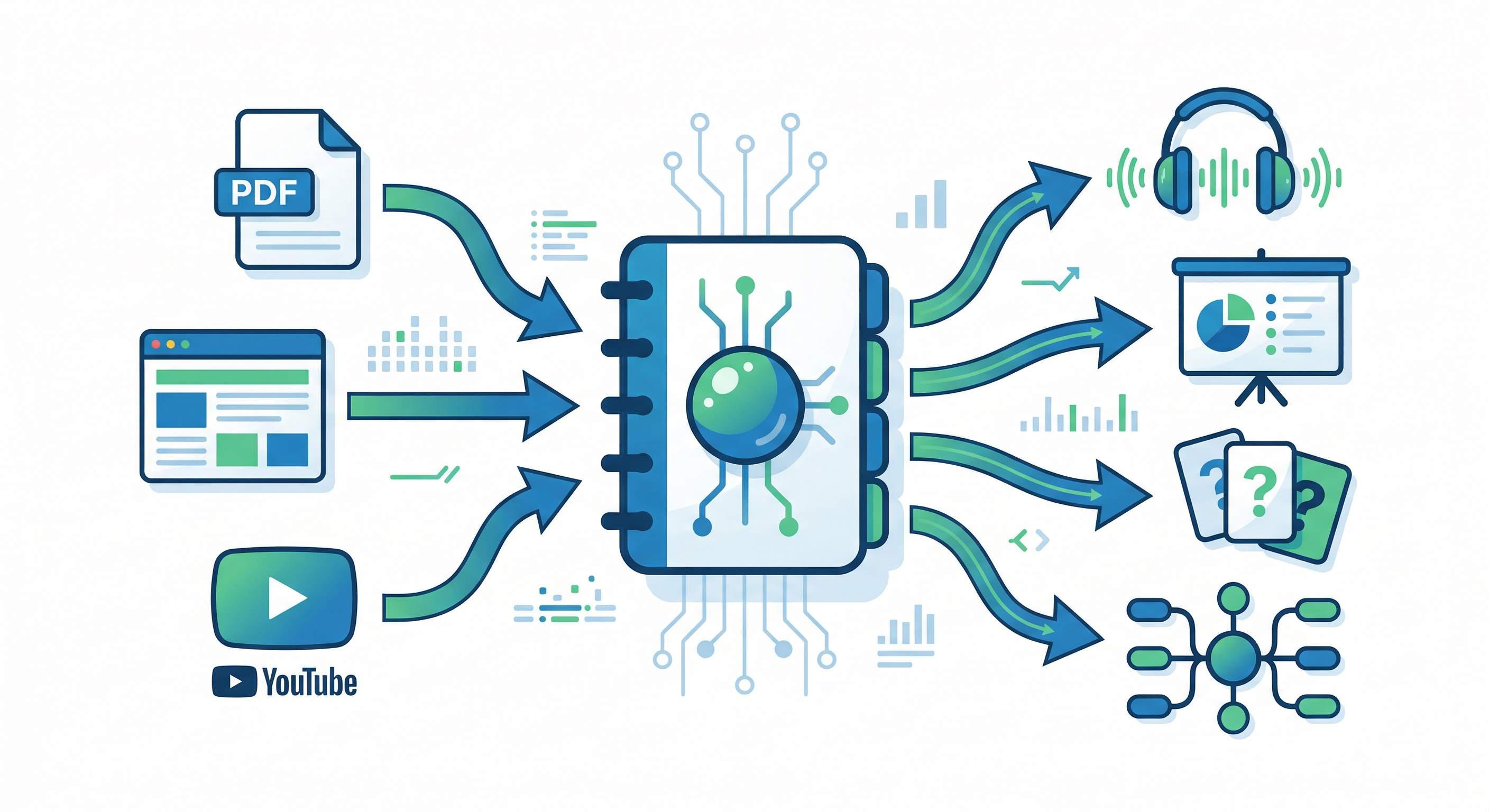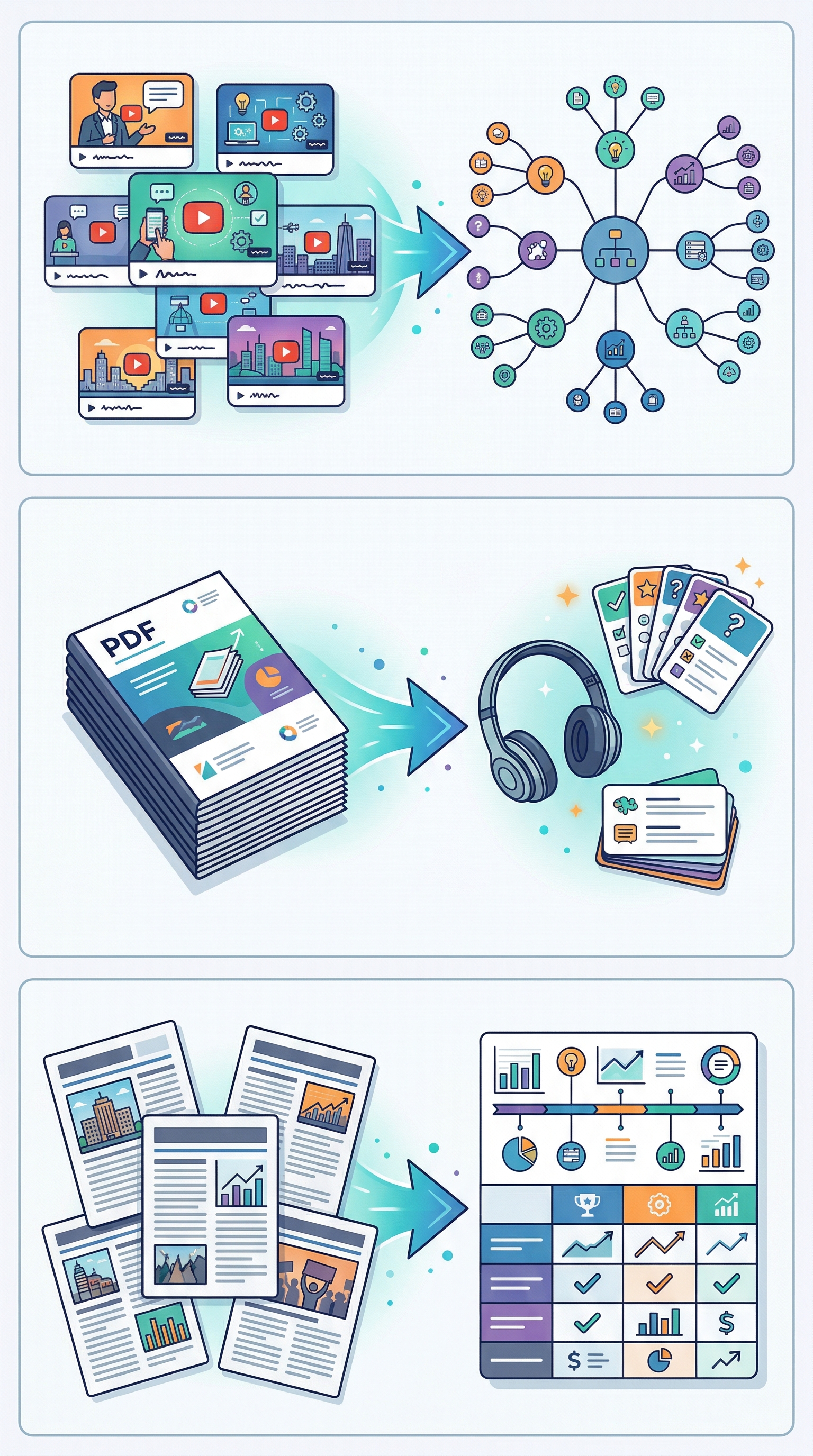 보고서 PDF 소스로 추가 → 팟캐스트 생성 (출퇴근길에 듣기) → 퀴즈 생성 (이해도 체크) → 플래시카드 생성 (핵심 개념 암기).